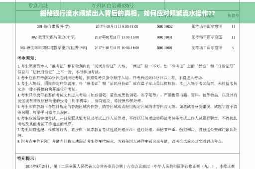 摘要:银行流水出入频繁,可能涉及多种情况,如个人消费、业务往来等。若频繁出入对个人财务造成困扰,建议采取以下措施:核查流水记录,确认交易真实性;合理规划个人财务,减少不必要的交易;与银行沟通,了解账户监管规定。理解银行流水背后的真相,有助于更好地管理个人财务。