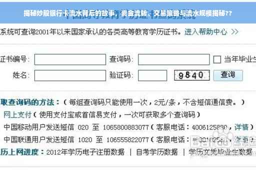 摘要:本文将揭示炒股银行卡流水的背后故事,探讨资金流转与交易策略之间的关系。通过深入了解炒股者的资金流动情况,揭示其交易习惯和策略选择。本文将分析银行卡流水的大小与炒股行为之间的联系,帮助读者更好地理解股市交易背后的细节。