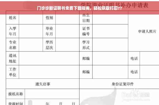 摘要:本指南提供了关于门诊诊断证明书的免费下载和打印的详细信息。通过本指南,用户可以轻松获取门诊诊断证明书,无需支付任何费用。步骤简单明了,用户只需按照指南操作,即可轻松获得证明书,方便快捷。??
