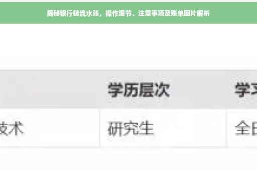 摘要:本文将揭秘银行转流水账的操作细节与注意事项。通过本文,您将了解到银行转流水账单的具体操作过程,包括转账的步骤、注意事项以及可能遇到的问题。还将提供银行转流水账单图片作为参考。本文旨在帮助读者更好地管理个人财务,避免在转账过程中出现问题。阅读本文,将帮助您轻松掌握银行转流水账的技巧。