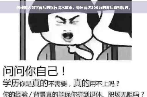 摘要:本文将揭示银行流水背后的惊人数字,每天高达200万的交易额度引人关注。通过深入了解银行流水,揭示数字背后的故事,包括其含义、来源以及可能的用途。对于普通人来说,银行流水每天200万是一个巨大的数字,反映了金融世界的繁荣与复杂性。本文旨在帮助读者更好地理解银行流水这一概念,并引导读者理性看待这一数字背后的真实含义。
