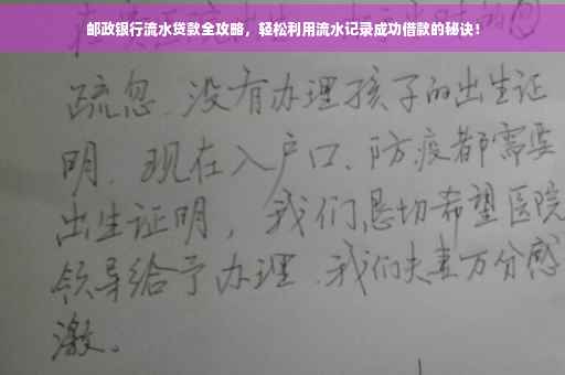 在当今社会,随着个人财务管理和理财规划的日益受到重视,邮政银行的贷款服务,特别是其流水贷款项目,已经引起了广大民众的关注,许多人利用邮政银行的流水记录来申请贷款,解决资金周转的问题,本文将详细解读邮政银行流水贷款的相关知识点,帮助大家了解如何利用流水记录轻松借款。