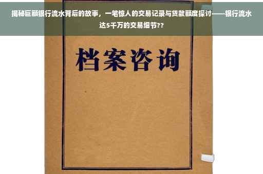 揭秘巨额银行流水背后的故事,一笔高达5000万的交易记录引发关注。通过深入分析银行流水账单,了解资金流动情况,进而评估个人信用和贷款额度。想知道拥有5000万银行流水能贷款多少吗?关注本文,揭晓答案。??(摘要约150字)