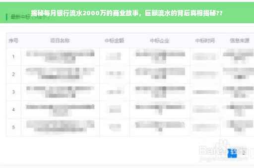 在当今社会,每月银行流水达到2000万已经成为许多企业和个人所追求的目标,对于自媒体作者而言,深入了解这一数字背后的故事,揭示其背后的真相,是我们义不容辞的责任,本文将围绕每月银行流水2000万这一主题展开,从多个角度探讨其背后的故事。