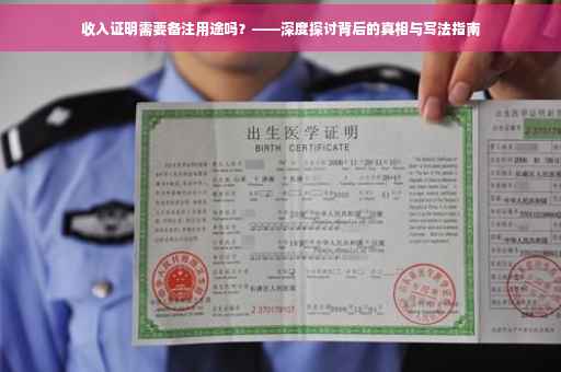 摘要:关于收入证明是否需要备注用途的问题,实际上取决于具体情况和具体要求。本文将深度解析背后的真相,探讨在什么情况下需要备注用途,以及如何在收入证明中恰当地进行备注。通过本文,您将了解收入证明的重要性,以及在撰写时需要注意的细节和技巧。