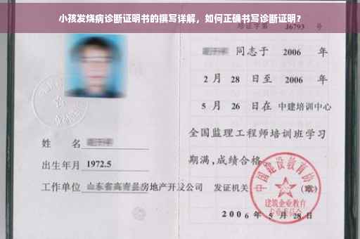 摘要:本篇文章介绍了小孩发烧病诊断证明书的详细写法。内容包括患者的基本信息、发烧的持续时间、伴随症状、诊断结果以及医生的建议和治疗方案等。诊断证明书是医疗证明的重要文件,要求准确、详细、清晰易读,以便家长了解孩子的病情以及医生的治疗方案。本文旨在为家长和医生提供参考,确保诊断证明书的准确性和有效性。