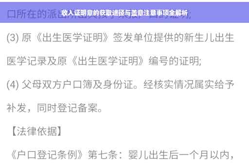 摘要:获取收入证明章时,需注意选择正规途径,如公司人力资源部门或银行。盖章位置通常为证明文件的右下角,需清晰可辨。注意事项包括确保证明内容真实、准确,避免使用假章或过期章,同时妥善保存收入证明以备查验。获取收入证明章时需谨慎,以确保其有效性和合法性。