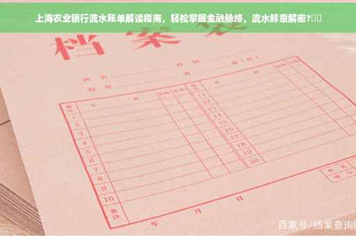 摘要:本文将详细介绍上海农业银行流水账单的获取方式及其内容解读。通过简单的步骤,您将轻松获取到自己的金融脉络,了解账户的资金流动情况。本文还将解释上海农业银行流水鲜章的相关事项,帮助您更好地理解流水账单的真实性。无论您是个人还是企业用户,都可以通过本文了解如何有效利用上海农业银行的流水账单,为您的财务管理提供便利。