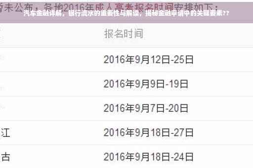 摘要:汽车金融领域,银行流水作为贷款审批的重要依据,其重要性日益凸显。银行流水能够真实反映借款人的财务状况和还款能力,是评估信用风险的关键环节。解读银行流水,不仅要看收入状况,还需关注支出结构,确保借款人具备稳定的还款能力。汽车金融确实需要银行流水作为参考,以确保贷款安全并降低风险。