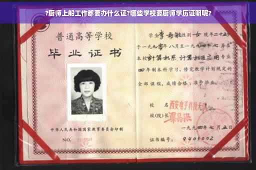 船上做厨师需要厨师证。厨师证是国家劳动保障部门颁发的国家职业资格证书,也是一个厨师求职、任职、开业的资格凭证。厨师证由中华人民共和国劳动和社会保障部统一印制,劳动保障部门或国务院有关部门按规定办理和核发。