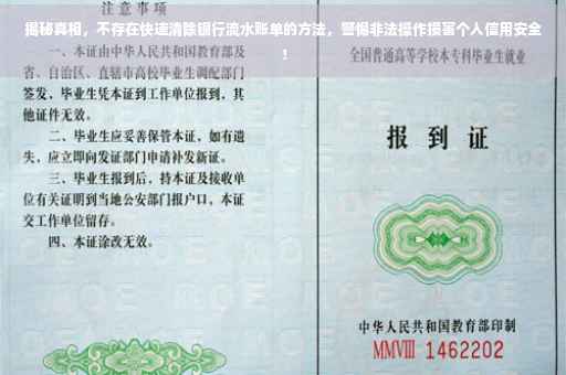 摘要:不要轻信所谓的快速清除银行流水的方法,因为这可能涉及非法操作,损害个人信用。银行流水账单是记录个人经济活动的重要文件,任何不当操作都可能影响个人信用记录和财务安全。请保持警惕,遵循合法途径处理银行流水账单,维护个人财务安全。
