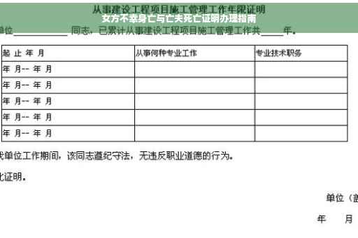 摘要:女方因不幸去世需办理亡夫死亡证明。此证明书用于确认女子亡夫的身份及死亡事实,以便处理相关后续事宜。办理过程中需提供相关证件和资料,如身份证、结婚证、死亡证明等。此证明书对于处理遗产、解决家庭纠纷等具有关键作用。办理此类证明时需遵守相关法律法规,确保提供真实有效的证明材料。