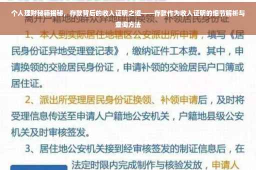 摘要:本文将为你揭示个人理财秘籍,探讨存款背后的收入证明之道。存款作为收入证明的一种形式,其真实性可通过银行流水账单进行验证。本文将教你如何正确理解和利用存款作为收入证明,通过合理的理财规划,实现财务自由。阅读本文,你将了解存款在理财中的重要性以及如何有效管理个人财务。