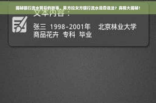 随着社会的不断发展,人们的生活方式和交往方式也在不断变化,在这个过程中,一些看似平常的行为背后可能隐藏着不为人知的秘密,关于“男方拉女方银行流水”的话题引起了广泛关注,这一看似简单的行为背后究竟隐藏着怎样的故事呢?本文将就此话题展开深入探讨。