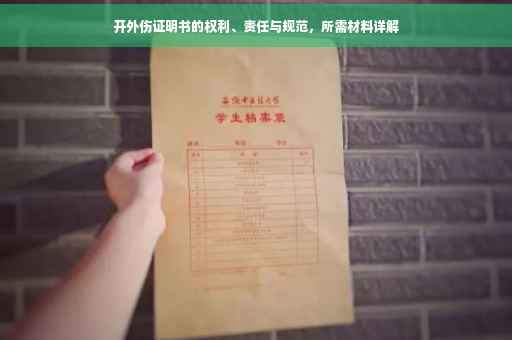 摘要:本文将探讨开外伤证明书的权利、责任与规范,包括开外伤证明所需的具体材料。文章将简要介绍外伤证明的重要性,阐述开具证明者的权利及责任,同时分析规范开具外伤证明的必要性和相关流程。将明确指出开具外伤证明所需的材料,包括患者身份证明、病历记录、诊断报告等。本文旨在提高对外伤证明的认识,确保开具证明的规范性和准确性。