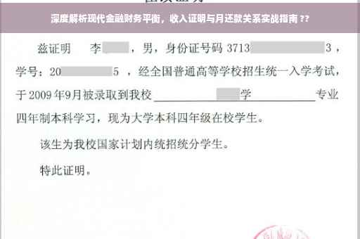 摘要:本文将探讨收入证明与月还款关系,深度解析现代金融中的财务平衡之道。文章将介绍如何合理制定收入证明,并阐述其与月还款之间的紧密联系。通过科学的财务规划,实现个人财务的平衡,避免因月还款压力影响生活质量。文章将提供实用的建议,帮助读者更好地管理个人财务,实现财务自由。