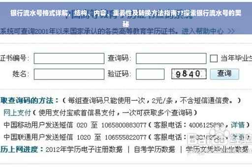 了解银行流水号的格式、结构和查询方法,能更好地利用这一金融工具确保金融交易的真实性和安全性,在生活中,建议妥善保管银行流水号,随时查询和核对资金情况,以保障个人或企业的合法权益。