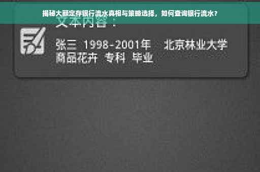 摘要:本文将探讨大额定存银行流水背后的真相与策略选择,包括如何查看银行流水。介绍大额定存银行流水的概念及其重要性。揭示背后的真相,包括可能的陷阱和风险。提供策略选择,包括如何选择合适的银行和存款方式,以及如何查看和分析银行流水,以确保资金安全。本文旨在帮助读者了解大额定存银行流水的真相并做出明智的决策。