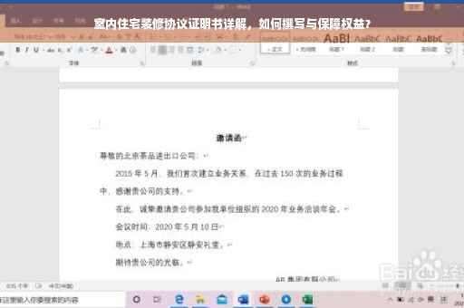 摘要:,,本文介绍了室内住宅装修协议证明书的撰写方法。该证明书是确保住宅装修工程按照协议进行的重要文件,内容包括双方基本信息、工程详情、装修标准、工期、付款方式等。通过明确各项条款,确保装修过程的顺利进行,保障业主和装修公司的权益。撰写时应注意清晰、准确、详尽,以确保证明书的法律效应。