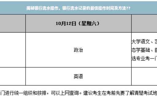银行流水操作的时间主要依据银行的营业时间,银行的营业时间是早上9点至下午5点,但具体营业时间可能因地区、银行差异而有所不同,在这个时间段内,客户可亲自前往银行柜台或通过网上银行、手机银行等方式进行流水操作。