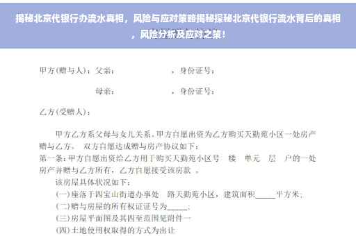 近年来,随着金融行业的快速发展,银行业务办理需求日益增多,在北京这座繁忙的都市里,一些人为了图方便或应对各种需求,选择通过代银行办理流水的方式处理银行业务,本文将深入探讨北京代银行办流水的真相、风险及应对之策,为广大读者揭示这一现象的真相。