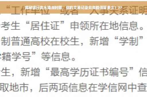 摘要:本文将探讨银行流水的追溯时限,解析银行交易记录能够保留多久的问题。通过阅读本文,您将了解到银行流水记录的具体追溯时间,以及影响追溯时限的各种因素。文章旨在帮助公众更好地理解银行流水记录的保存机制,并提醒个人注意交易记录的保密和保护。