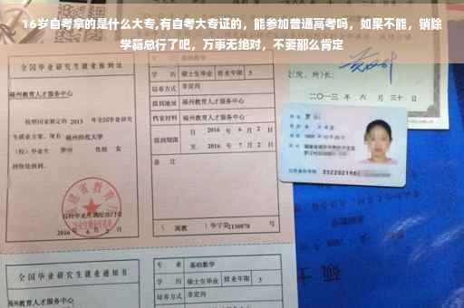 16岁自考拿的是非全日制大专。因为16岁通过自考的话毕业是发非全日制自考大专毕业证。因为自考,成人高考,函授都是属于我国非全日制大专教育,毕业都是不会发全日制统招大专毕业证,只会发非全日制函授,非全日制成人,非全日制自考文凭