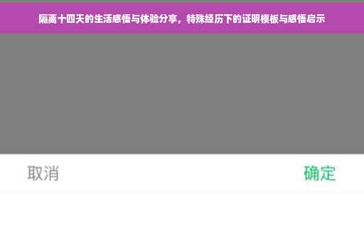 摘要:本篇文章主要围绕隔离十四天证明书的主题展开,分享了一段特殊经历下的生活感悟与体验。作者在隔离期间深刻体会到了生活的不易和珍惜当下的重要性,通过这段经历,作者有所感悟并获得了成长。文章还提供了隔离十四天证明的模板,方便读者了解相关流程。
