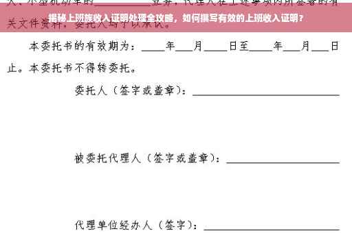 摘要:本文将为你揭示上班族收入证明处理的全攻略。从了解收入证明的重要性开始,我们将详细介绍如何撰写一份规范的上班收入证明,包括关键信息的填写、注意事项等。本文还将分享一些常见的收入证明模板,帮助你更快更好地完成收入证明的撰写。无论你是需要贷款、办理信用卡还是其他用途,本文都能为你提供实用的建议。