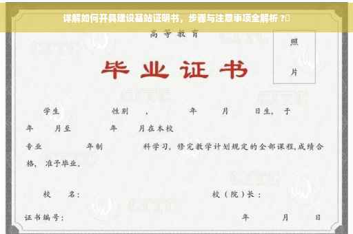 摘要:想要开具建设基站证明书,需遵循一系列详细步骤与注意事项。了解相关政策和规定,确保基站建设的合法性和合规性。准备申请材料,包括基站建设方案、土地使用权证明、环境影响评估等。向当地无线电管理部门递交申请,并等待审批。在开具证明过程中,需注意填写准确的信息,确保证明书的真实性和有效性。关注环保和安全要求,确保基站建设符合相关标准。遵循这些步骤和注意事项,即可顺利开具建设基站证明书。