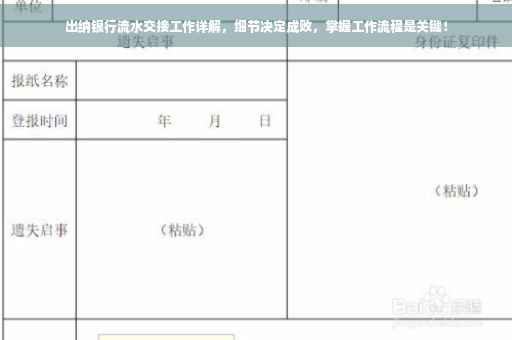 在银行日常运营中,出纳银行流水交接工作是一项至关重要的环节,它不仅关系到银行内部资金的安全,也涉及到客户信息的保密,本文将详细介绍出纳银行流水交接工作的流程、注意事项及常见问题处理,旨在帮助读者更好地理解和掌握这一工作。