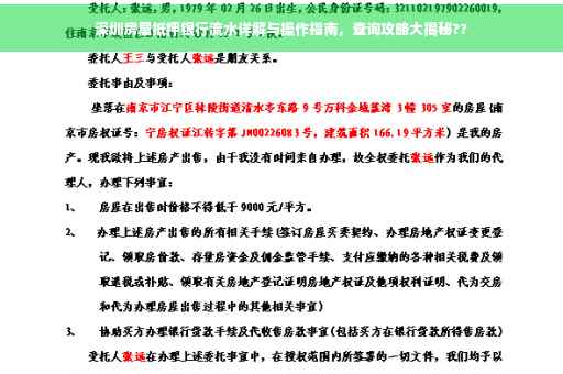 摘要:本文将全面解读深圳房屋抵押银行流水的相关事项,包括查询流程、注意事项等。通过本文,您将了解如何操作房屋抵押银行流水查询,以便更好地管理个人财务和资产。对于在深圳地区需要办理房屋抵押业务的读者,本文提供了实用的操作指南。