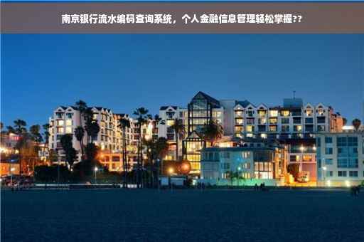在现代社会,随着金融科技的飞速发展,越来越多的人开始关注个人金融信息的查询和管理,南京银行作为一家具有深厚历史底蕴的金融机构,为广大客户提供了便捷高效的金融服务,本文将详细介绍南京银行流水编码查询的方法,帮助大家轻松掌握个人金融信息,实现财务自由。