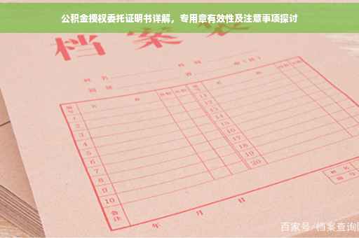 摘要:本文介绍了授权委托证明书公积金专用的相关内容,询问使用公积金专用章是否有效。文章指出,授权委托证明书公积金专用是指用于办理公积金相关业务的授权委托证明文件,而公积金专用章则是用于确认该证明文件的真实性及有效性的印章。使用公积金专用章可以确保证明文件的合法性和权威性,但必须确保章的真实性和合法性。