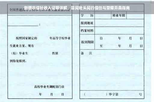 摘要:,,新疆农信社收入证明详解,介绍如何开具收入证明以及其在田间地头所代表的信任与荣耀。该证明是农信社对客户经济能力的有力证明,也是客户信用的一种体现。本文将指导读者了解开具收入证明的具体步骤和注意事项,帮助大家顺利获取这一来自田间地头的信任标志。
