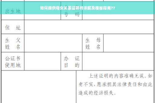 摘要:本文将详细介绍如何提供母女关系证明书。需要明确证明的目的和流程。提供官方认可的母女关系证明模板,包括姓名、身份证号等关键信息。在准备过程中,确保所有证明文件的真实性和合法性。强调遵守相关法律法规的重要性,确保提供的证明文件具有法律效力。本文旨在帮助读者顺利完成母女关系证明书的办理。