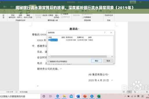 近年来,随着金融行业的快速发展,银行业务日益繁忙,其中银行流水作为记录个人和企业资金往来的重要凭证,也愈发受到人们的关注,在2019年,不少人的银行流水出现了异常情况,引起了广泛的社会关注,我们就来深入剖析这一现象的成因、影响以及应对措施。
