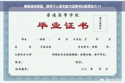 摘要:个人英文能力证明书是展示个人在英语能力方面的实力,有效跨越语言障碍的重要证明。撰写时,应突出个人的英语水平,包括听、说、读、写各方面的能力。内容应涵盖证书颁发机构、个人基本信息、英语等级或成绩,以及个人在英语交流、应用方面的实际能力表现。通过个人英文能力证明书,充分展现自我实力,为国际交流、工作或学习增添优势。