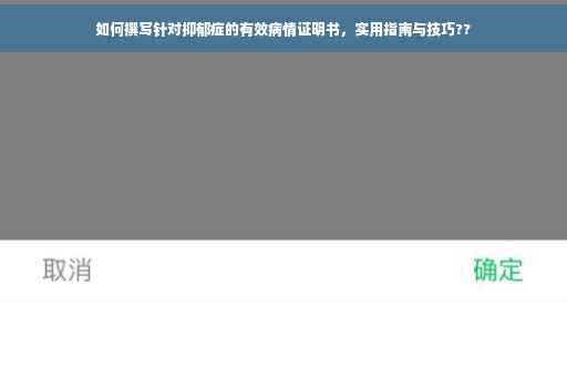撰写一份有效的病情证明书对于抑郁症患者而言至关重要,通过了解病情证明书的重要性、主要内容、撰写步骤、技巧与注意事项,您将能够撰写出一份详尽且有效的病情证明书,希望本文能对您撰写病情证明书有所帮助,祝您早日康复。