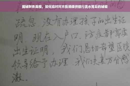 摘要:面对财务真相的揭示,当对方拒绝提供银行流水时,背后可能隐藏着不为人知的秘密。若对方拒绝出具银行流水,不必过于担心,可以采取一些策略应对。通过深入了解对方的财务状况、寻求专业财务咨询或采取法律手段,有助于揭开真相。保持冷静、理智地处理这种情况至关重要。