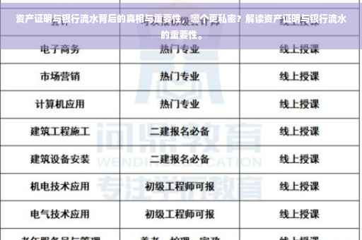 摘要:资产证明与银行流水都是反映个人或企业经济状况的重要文件,但二者在私密性和重要性方面有所不同。资产证明是证明个人或企业资产状况的文件,更加私密,一般只在特定情况下使用。而银行流水则是记录个人或企业在银行交易情况的账单,重要性较高,可用于贷款、信用卡申请等场景。了解这两者的真相和重要性,有助于我们更好地管理自己的财务。