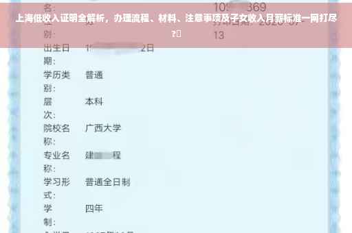 上海市低收入证明详解:本文介绍了办理低收入证明的流程和所需材料,同时提醒注意事项。办理流程包括填写申请表、提供相关证明材料等步骤。所需材料包括个人身份证明、收入证明、家庭成员情况等。文章还特别提到了子女收入月薪标准。本文旨在帮助申请人全面了解低收入证明的办理过程,以便顺利获得相关证明。