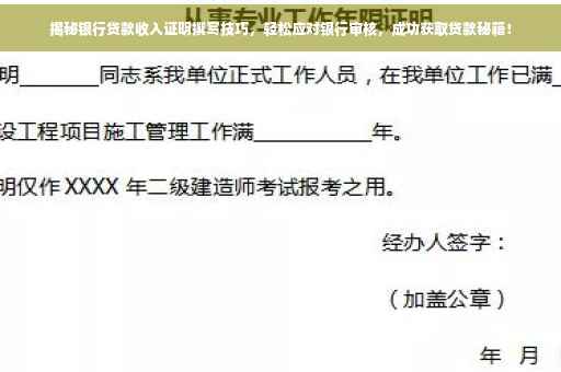摘要:本文将介绍如何撰写银行贷款收入证明,以应对银行审核并成功获取贷款。文章将详细阐述收入证明的关键要素和注意事项,包括收入状况、职业信息、征信记录等。通过本文的指导,申请人可以更加轻松地准备收入证明,提高贷款申请的成功率。