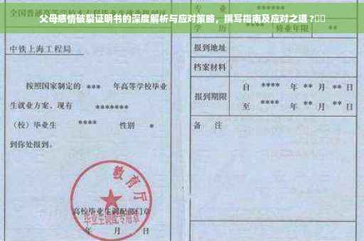摘要:本文将探讨父母感情破裂证明书的深度解析及应对之道。文章将简要介绍父母感情破裂证明书的含义和作用,分析其中的关键因素和挑战,并提供应对方法。面对父母感情问题,我们应积极沟通、理性处理,以维护家庭和谐。本文旨在帮助读者更好地理解和应对父母感情破裂证明书的重要性。