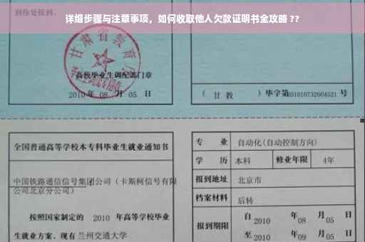 摘要:,,本文介绍了收取他人欠款证明书的详细步骤与注意事项。了解欠款情况并确认证明书真实性。与欠款人沟通协商,确保双方权益。制定收款计划并保留相关证据。在收取过程中,注意法律手续和欠款人的支付能力。完成收款后妥善保管相关文件。注意事项包括确保合法合规、谨慎处理与欠款人的关系以及及时咨询专业法律意见。