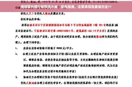 摘要:本文将介绍国外银行转账流水单的查询方法和操作指南,包括注意事项。读者将了解到如何获取银行转账流水单,以及如何检查其中的详细信息。本文将提供实用的建议和提示,帮助读者顺利完成银行转账流水单的查询,确保信息的准确性和安全性。