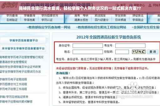 摘要:本文将为你揭秘民生银行流水查询的便捷方式,提供一站式解决方案,助你轻松掌握个人财务状况。通过简单的步骤,你将能够方便地查询民生银行流水,实现个人财务的透明化管理。无论是查询账户余额还是交易明细,一站式服务将为你提供全面的财务信息支持。