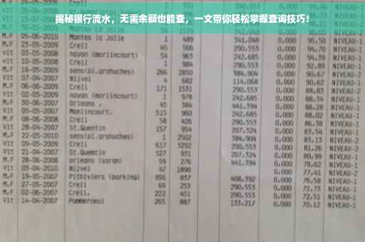 摘要:银行流水揭秘,无需余额也能查询!想要深入了解银行流水,只需阅读本文,即可掌握查询方法。无需关注账户余额,只需通过网银、手机银行或柜台等渠道,即可轻松查询流水记录。本文带你全面了解银行流水,让你的财务管理更加便捷高效!