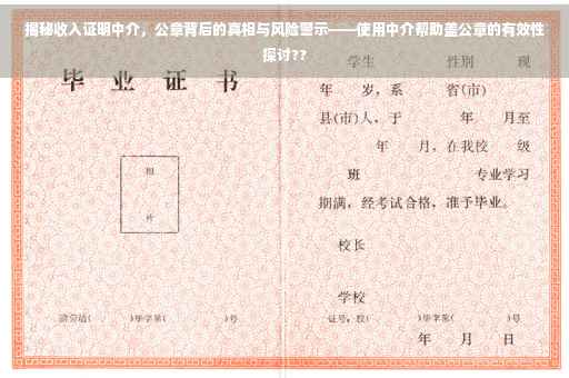 摘要:本文揭示了收入证明中介背后的真相与风险警示,探讨了这些中介使用公章开具的收入证明是否有效。文章指出,使用中介的公章存在风险,可能导致法律纠纷和信誉损失。提醒公众谨慎对待收入证明中介,避免陷入不必要的麻烦和风险。摘要字数控制在约150字左右。