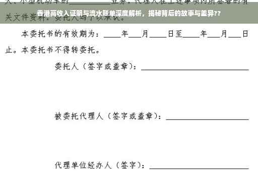 摘要:本文将探讨香港高收入证明与流水账单的深层次区别。介绍两者在证明个人经济状况方面的重要性,并详细解析其背后的故事。文章将解释高收入证明与流水证明的不同之处,包括其定义、用途以及申请流程等。通过本文,读者将更好地了解这两种证明在香港的实际应用及其对个人经济生活的影响。